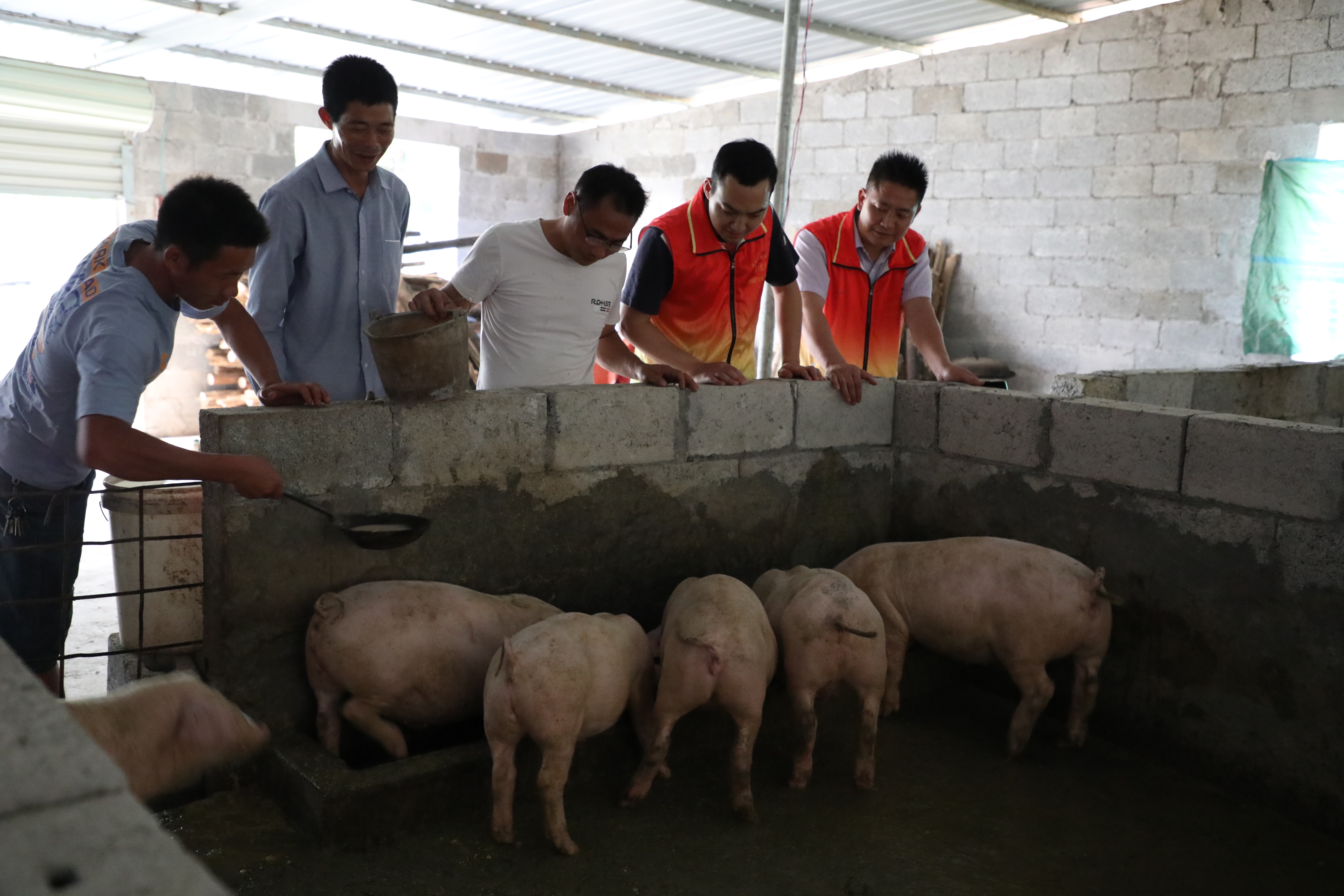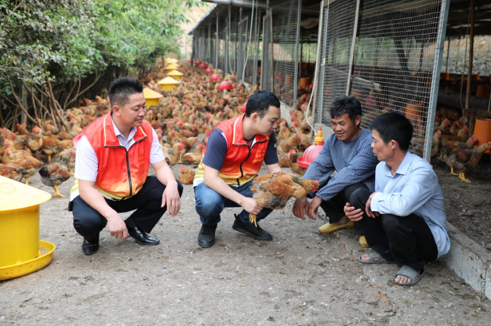 工作隊(duì)員正在和養(yǎng)殖戶觀察肉雞生長(zhǎng)情況